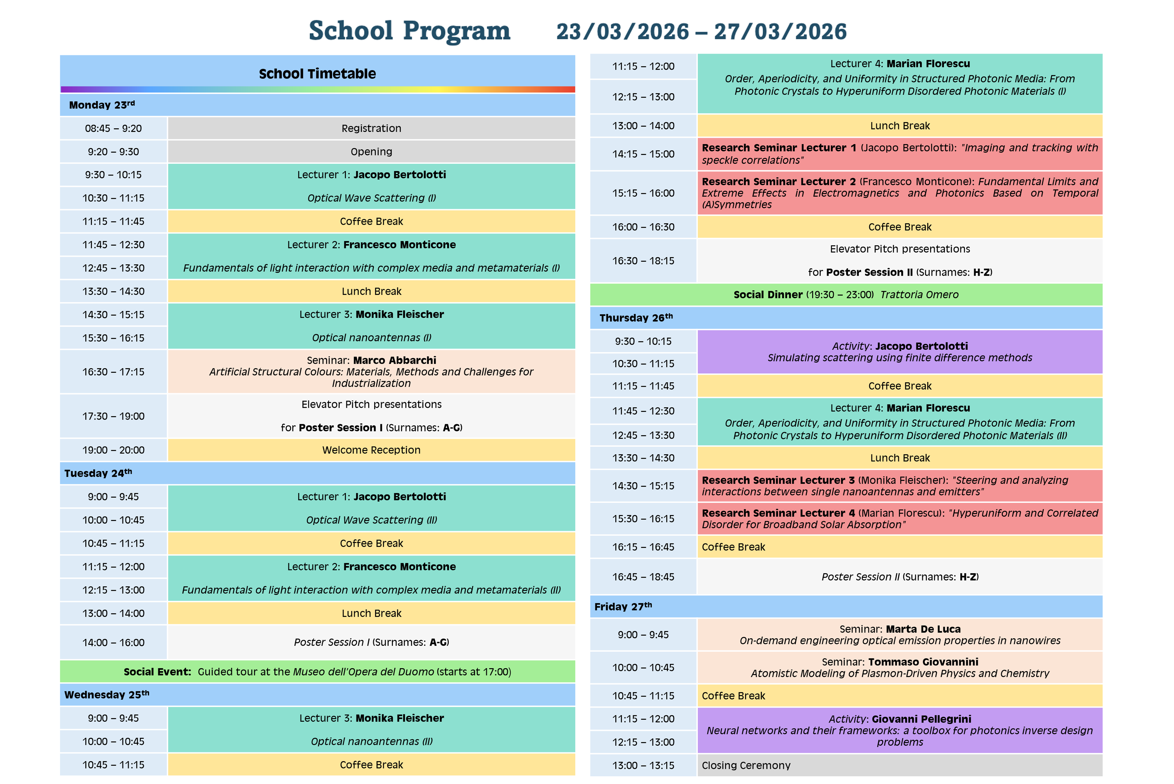 The 5th edition of the International School on Plasmonics and Nano-optics will be held in Arcetri, Florence (IT) from March 23rd to 27th, 2026. The school will bring together doctoral students, early-stage researchers and renowned academics working in various fields of light–matter interaction at the nanoscale. Frontal lectures, covering both fundamentals and applied aspects of Plasmonics and Nano-optics, will be complemented by scientific seminars, introducing the latest discoveries and application trends of the field. The participants will be involved in active learning tasks, which will encourage interaction with lecturers and multidisciplinary collaborations. The School is organized and promoted by PLASMONICA - the Italian community of plasmonics and nano-optics and a working group of the Italian Optical Society (SIOF), the italian branch of the European Optical Society (EOS).